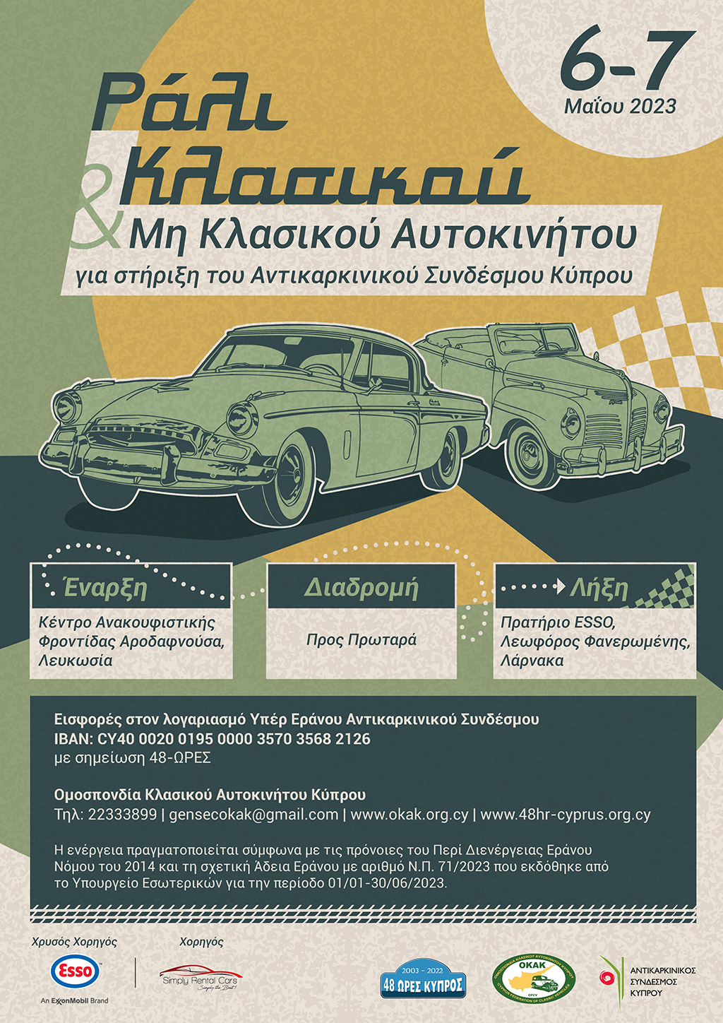 Η Ομοσπονδία Κλασικού Αυτοκινήτου Κύπρου (ΟΚΑΚ) διοργανώνει εδώ και είκοσι (20) χρόνια, το ράλι κλασικού αυτοκινήτου «48 Ώρες Κύπρος» για στήριξη του Αντικαρκινικού Συνδέσμου Κύπρου, με την ευγενική χορηγία της ΕxxonMobil/ Esso Κύπρου.