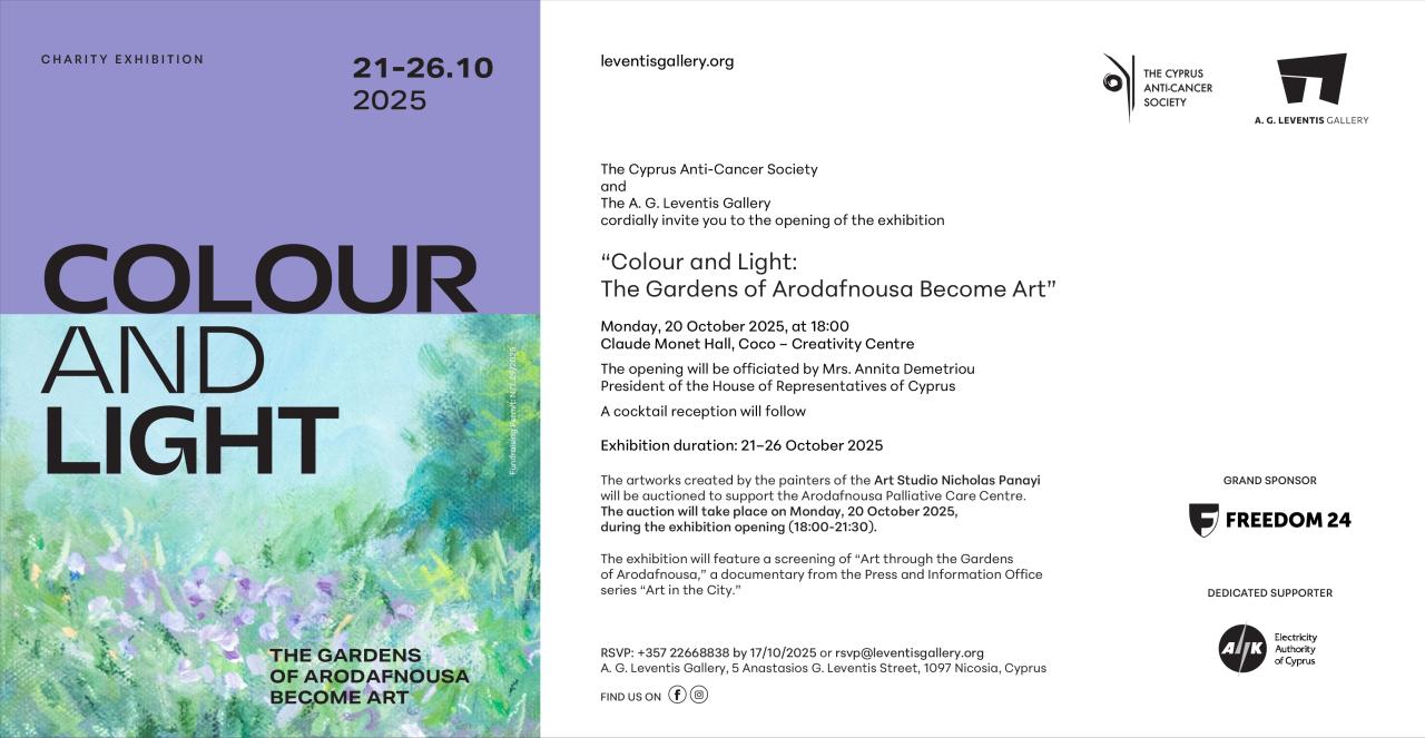 Ο Αντικαρκινικός Σύνδεσμος Κύπρου και η Λεβέντειος Πινακοθήκη παρουσιάζουν την έκθεση «Χρώμα και Φως: Οι κήποι της Αροδαφνούσας γίνονται Τέχνη», μια ξεχωριστή πρωτοβουλία που ενώνει τον κόσμο της τέχνης με αυτόν της προσφοράς.