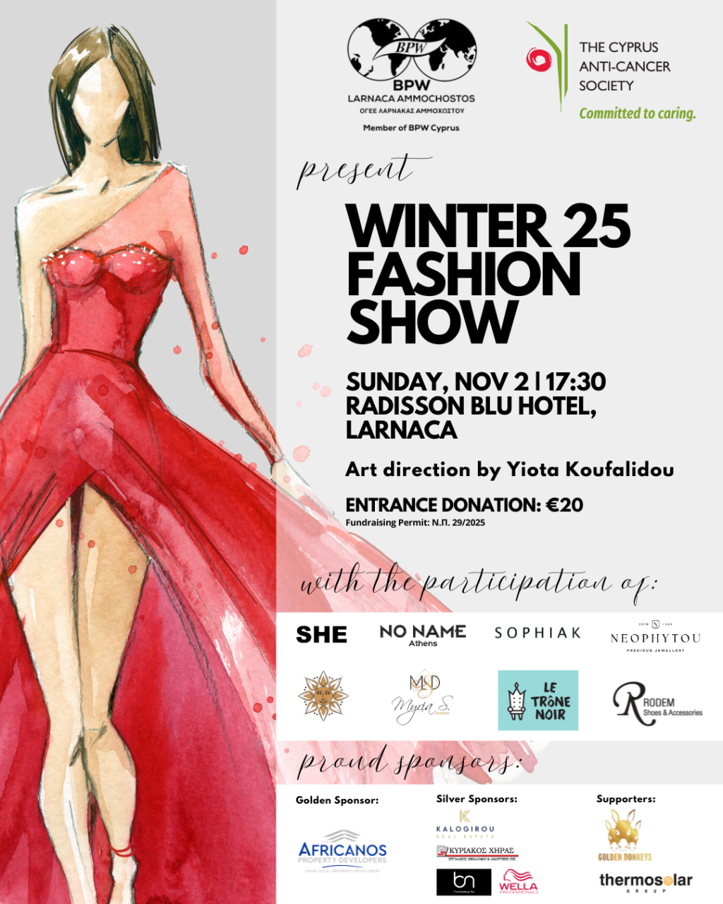 Η Οργάνωση Επαγγελματιών και Επιχειρηματιών Γυναικών Λάρνακας – Αμμοχώστου BPW Larnaca Ammochostos, μέλος της BPW Cyprus, σε συνεργασία με τον Αντικαρκινικό Σύνδεσμο Κύπρου, παρουσιάζουν το Winter 25 Fashion Show, την Κυριακή, 2 Νοεμβρίου 2025, στις 17:30, στο Radisson Blu Hotel, στη Λάρνακα.