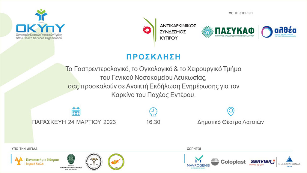 Ανοικτή Εκδήλωση Ενημέρωσης για τον καρκίνου του Παχέος Εντέρου διοργανώνεται την Παρασκευή 24 Μαρτίου 2023 στις 16:30 στο Δημοτικό Θέατρο Λατσιών.