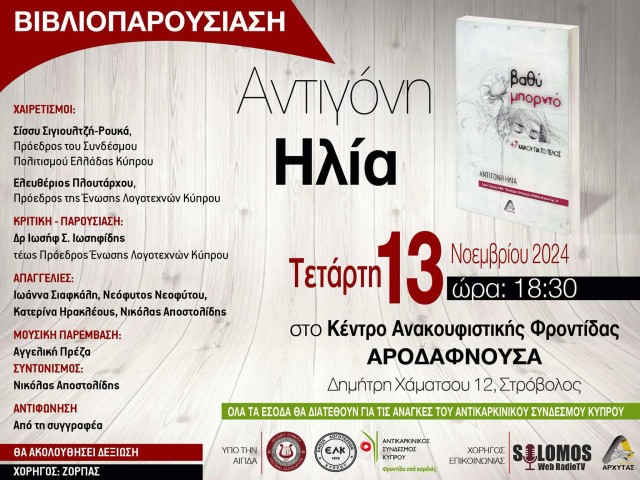 Η παρουσίαση θα πραγματοποιηθεί την Τετάρτη 13 Νοεμβρίου 2024 και ώρα 6:30μμ, στο Κέντρο «Αροδαφνούσα». Όλα τα έσοδα από τις πωλήσεις του βιβλίου θα διατεθούν για στήριξη του έργου και των υπηρεσιών του Αντικαρκινικού Συνδέσμου Κύπρου.