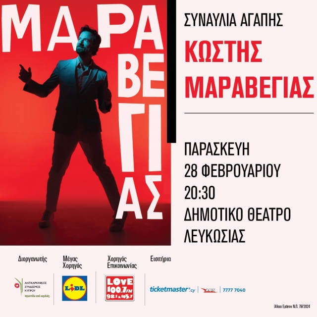 Ο Αντικαρκινικός Σύνδεσμος Κύπρου, με την πολύτιμη στήριξη της Lidl Κύπρου, παρουσιάζει τον μοναδικό Κωστή Μαραβέγια σε μια ξεχωριστή Συναυλία Αγάπης την Παρασκευή 28 Φεβρουαρίου 2025, στις 8.30 το βράδυ στο Δημοτικό Θέατρο Λευκωσίας. Μια βραδιά γεμάτη μουσική, συναίσθημα και ανθρωπιά, αφιερωμένη σε όλα όσα έχουν πραγματική αξία στη ζωή μας.
